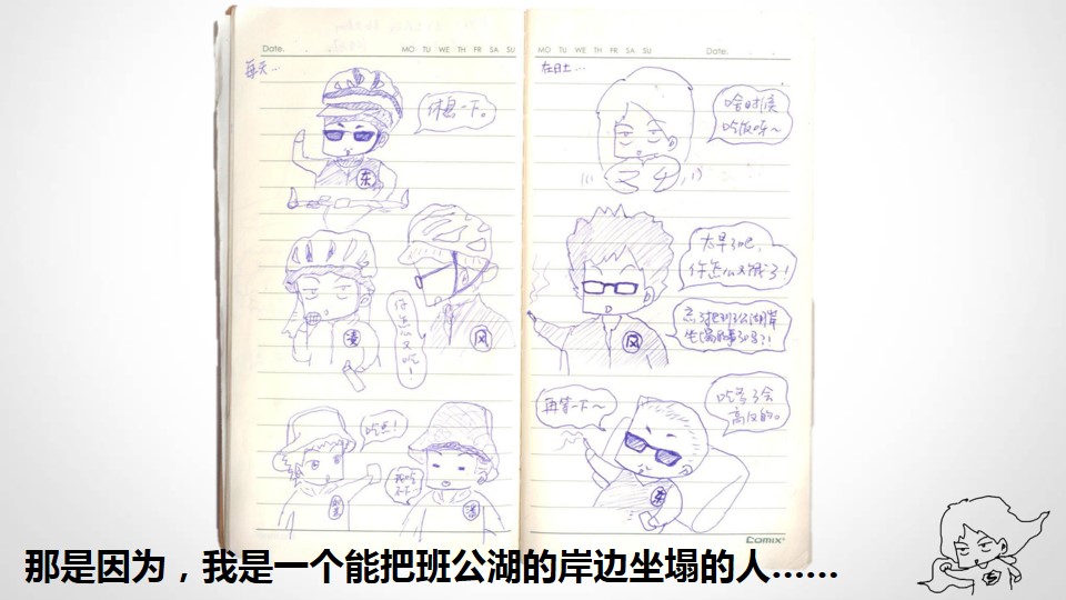 路过一个歪倒了的交警模型,我一边快速地骑过去,一边伸出右手拍了一下他伸出的胳膊。爱死了这一刻的淘气。